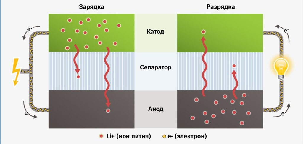 В процессе разрядки литий-ионного аккумулятора положительно заряженные ионы лития движутся от анода к катоду через электролит, а электроны — по электрической цепи. Получаемая в этом процессе полезная энергия идет на питание смартфона, фитнес-браслета или электробуса.