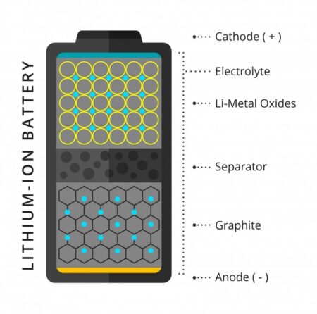 Lithium-ion battery — литий-ионный аккумулятор, Cathode — катод, Electrolyte — электролит, Li-Metal Oxides — литий-металл оксид, Separator — разделитель, Graphite — графит, Anode — анод. Источник: kuzov-media.ru