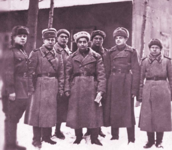 Лейтенант медицинской службы Н. Г. Басов с боевыми товарищами, Подмосковье, 1943 год