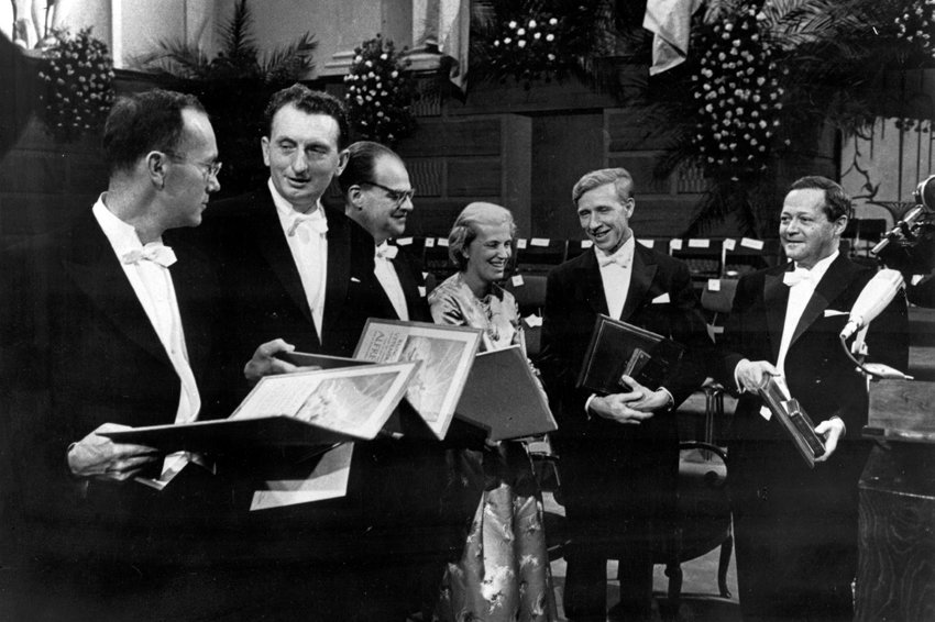 Вручение Нобелевской премии по физике, Здание Стокгольмской Городской Ратуши,1964 год, (Слева направо Ч. Таунс, А. М. Прохоров, Н. Г. Басов)