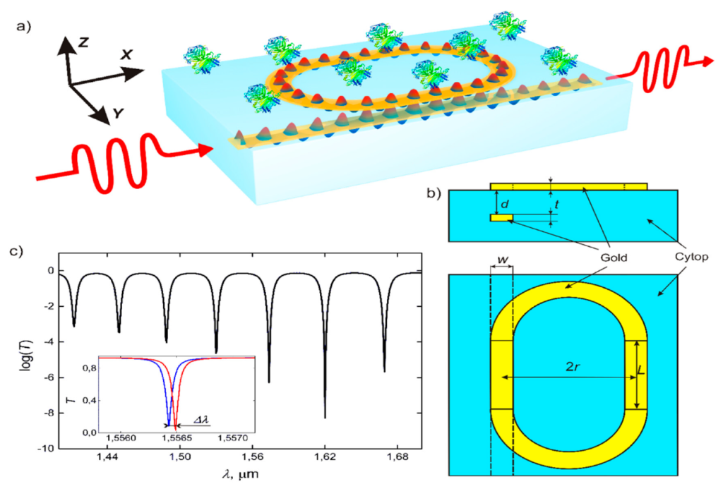 В предложенной учеными новой компоновке биосенсора вся его оптическая часть — источник и детектор излучения — располагается внутри диэлектрика. Снаружи же остается только чувствительная зона конструкции — золотое колечко диаметром несколько десятков микрометров и толщиной несколько десятков нанометров.