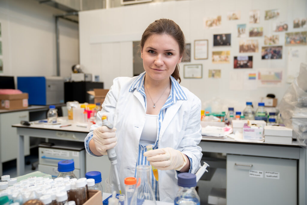 Елизавета Мочалова, аспирантка МФТИ, готовит образцы для проверки эффективности распознавания раковых клеток созданными наноагентами. Фотограф — Евгений Пелевин, пресс-служба МФТИ