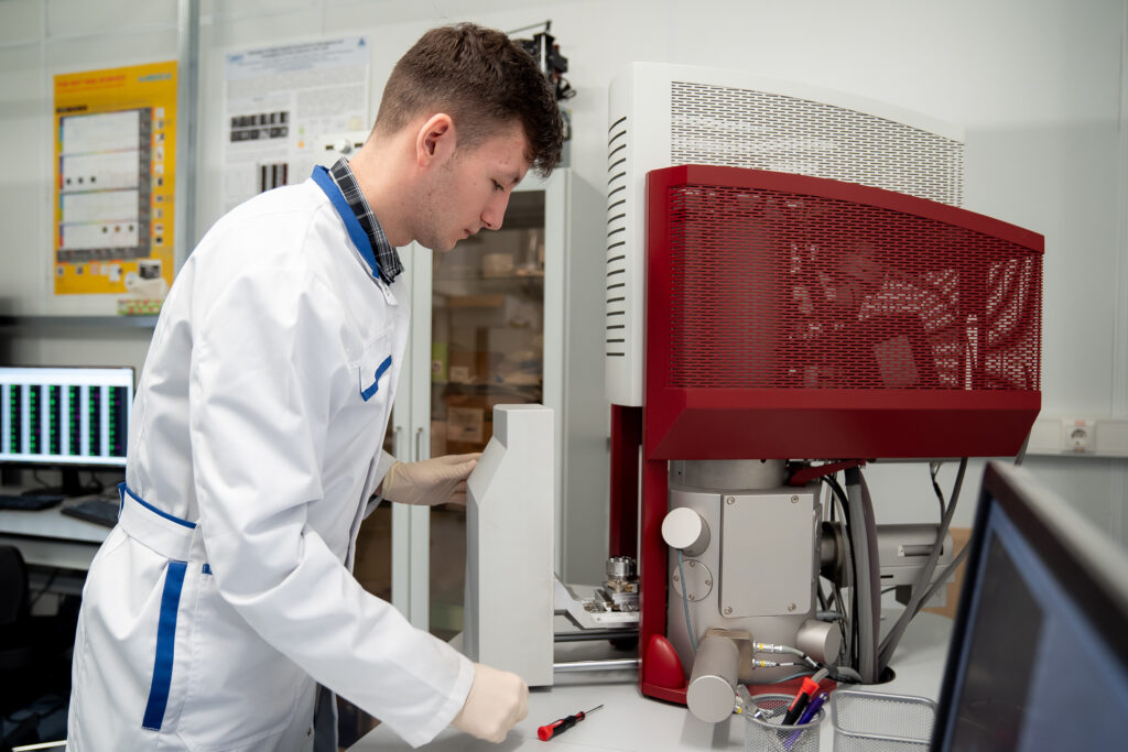 Андрей Бабёнышев, аспирант МФТИ, загружает образцы в сканирующий электронный микроскоп. Фотограф — Евгений Пелевин, пресс-служба МФТИ