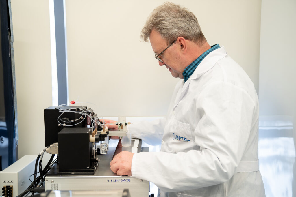 Владимир Черкасов, ведущий научный сотрудник лаборатории нанобиотехнологий МФТИ, делает тестовые полоски для экспресс-ДНК-диагностики. Фотограф — Евгений Пелевин, пресс-служба МФТИ