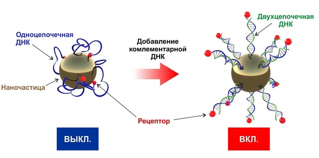 Активация рецептора на поверхности наночастиц при добавлении комплементарной нити ДНК. Предоставлено авторами исследования