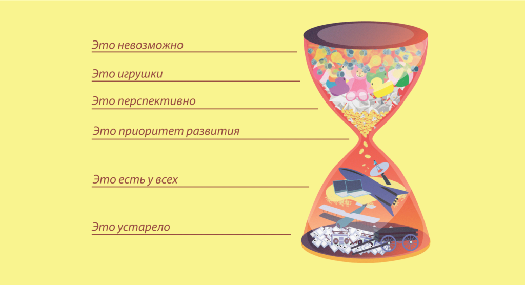 Если коммерческие образцы успешны, они привлекают к себе больше внимания и денег. Технология развивается, и если она достаточно хороша, большие научно-технические игроки начинают обращать на нее внимание: она может стать одним из приоритетных направлений развития. На этом этапе вкладываются совсем другие деньги, подключаются все уровни разработок — от фундаментальных институтов до маленьких стартапов. И технологии идут в жизнь.