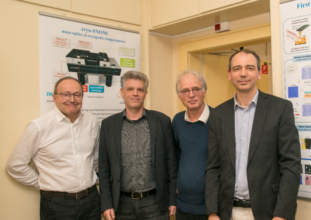 На инаугурации лаборатории криогенной нано-оптики Университета Женевы, Швейцария (2018). Слева направо: Жан-Марк Трисконе (Jean-Marc Triscone, проректор университета), Кристоф Реннер (Christoph Renner), Дирк ван дер Марел (Dirk van der Marel), Алексей Кузьменко