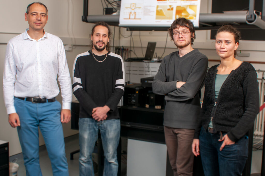 Сотрудники лаборатории криогенной нано-оптики Университета Женевы, Швейцария (2019). Слева направо: Алексей Кузьменко, Иван Ардиццоне (Ivan Ardizzone), Адриян Берше (Adrien Bercher), Ирис Крассе (Iris Crassee).