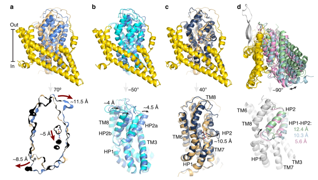 Глутаматные транспортеры — это катион-связанные вторичные активные мембранные транспортеры, которые очищают синаптическую щель от глутамата. Сотрудники лаборатории электронной микроскопии биологических систем с помощью криоэлектронной микроскопии получили структуру гомолога глутаматного транспортера, встроенного в липидные нанодиски. Оказалось, что белок состоит из трех мономеров. В зависимости от используемых концентраций субстрата, протомеры тримера принимают различные асимметричные конформации, соответствующие независимому движению. Шесть из 15 разрешенных протомеров находятся в до сих пор неуловимом состоянии транспортного цикла, в котором обращенные внутрь части транспортеров загружены ионами Na. Эти структуры объясняют, как предотвращается утечка субстрата — строгое требование для сопряженной транспортировки. Результаты опубликованы в журнале Nature Communications.