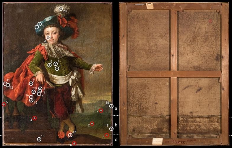 На левом фото красным показаны места отбора проб для последующего анализа. Как видно, исследователи избегали участков центральной части портрета. Белым отмечены точки проведения рентгенофлуоресцентной спектроскопии, не требующей отбора проб. На обратной стороне полотна качество выполнения швов различается. Источник: Николай Симоненко и др., Heritage Science