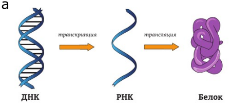 Ранее считалось, что РНК — это лишь промежуточная стадия между ДНК и белком (рисунок 1а). Но когда научный мир начал описывать работу генома, оказалось, что далеко не все участки ДНК кодируют РНК. Более того, даже те, с которых считывается РНК, не обязательно кодируют белки. Функция большинства некодирующих РНК до сих пор неочевидна. В разных типах клеток должны работать разные гены и синтезироваться разные белки: в клетке мозга — одни, в клетке крови — другие. Это значит, что существуют факторы, которые влияют на активность генов. Теперь ученые начали понимать, что некодирующие РНК также являются одним из этих факторов.