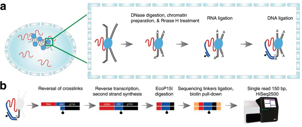 а) Реакции, производимые в ядре клетки. Красным показана РНК, черным — ДНК, голубым — белки, синим — связующая молекула. Черная точка — молекула, позволяющая «выцепить» комплекс из раствора. Пояснения даны в тексте. b) Реакции, производимые в растворе: 1) удаляются белки, 2) достраивается вторая цепь, 3) обрезается до определяемого размера, 4) присоединяются последовательности для распознавания и 5) производится секвенирование. Источник: Nature Communication