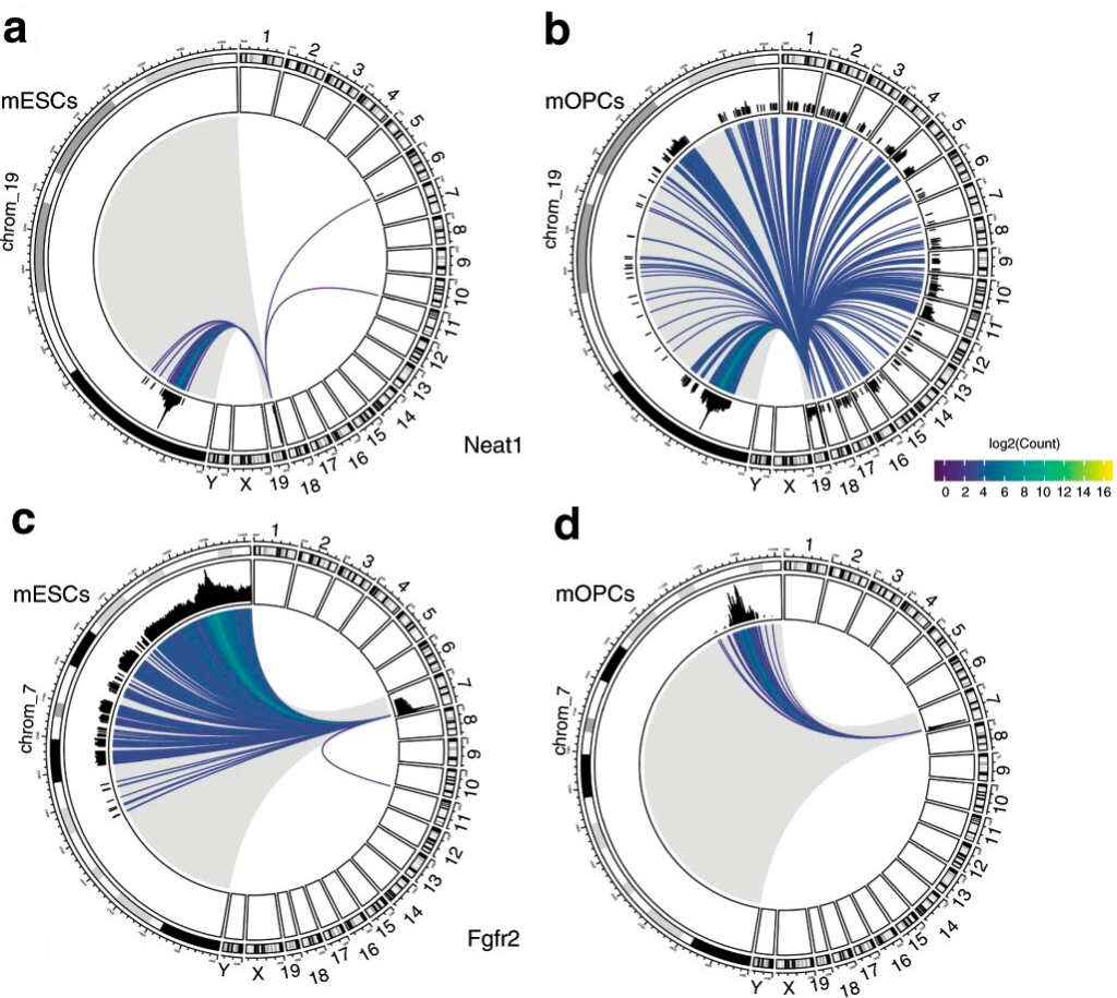 Диаграммы, изображающие взаимодействия некодирующих РНК: Neat1 (a, b) и Fgfr2 (c, d) в эмбриональных стволовых клетках мыши (mESC) и клетках-предшественниках олигодендроцитов (mOPC). Neat1 синтезируется с 19-й хромосомы, а Fgfr2 — c 7-й. Источник: Nature Communication