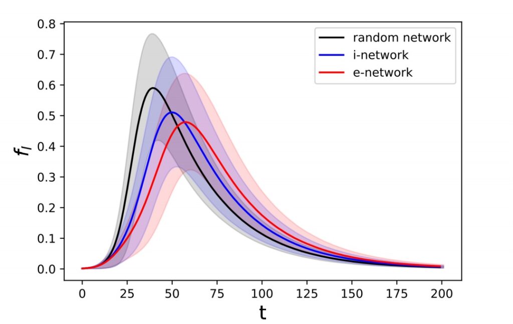 Доля зараженных в зависимости от времени для случайной сети и сетей типа i и e. Затененные интервалы показывают диапазон значений, по которым производилось усреднение в численных экспериментах по каждой сети. Черная линия — случайная сеть, синяя — сеть типа i, красная — сеть типа e. Источник: O. Valba, arxiv.org