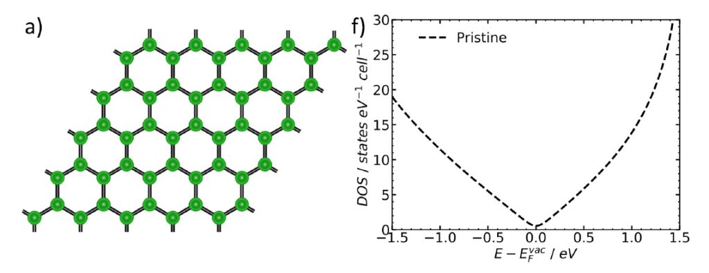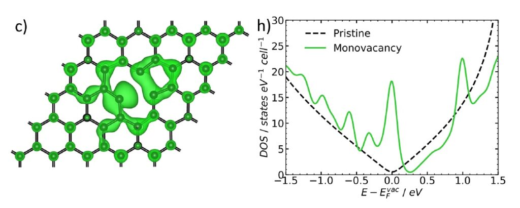 Сравнение электронных свойств бездефектного графена (a, f) и графена, содержащего вакансию (c, h). Возникновение локальных электронных состояний вблизи уровня ферми во втором случае катализирует неадиабатический гетерогенный перенос электрона. Источник: Vitaliy A.Kislenko, Electrochimica Acta