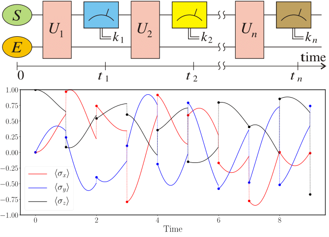Разрывные линии показывают, что состояние системы испытывает «коллапс» при измерениях. Источник: Physical Review Letters