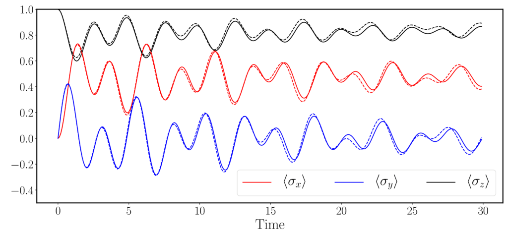 Результат работы нового алгоритма машинного обучения для квантовых систем: сплошная кривая — теория, пунктирная кривая — предсказание алгоритма. Источник: Physical Review Letters