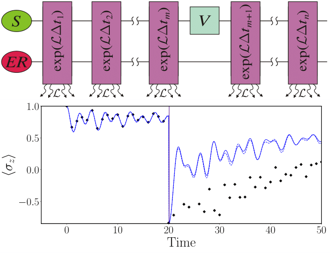 Предложенный учеными алгоритм машинного обучения позволяет правильно учесть влияние управляющего воздействия V на систему S (синие кривые), в то время как стандартный подход на основе томографии процесса не может этого сделать (черные точки). Источник: Physical Review Letters