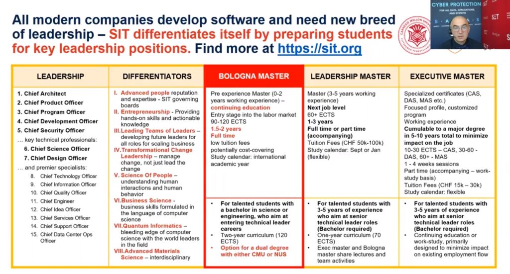 Институт SIT находится в городе Шаффхаузене (Швейцария), а магистр информатики и программной инженерии — это первая магистерская программа SIT. Она соответствует традиционной болонской европейской системе высшего образования и подходит для студентов, которые в настоящее время заканчивают обучение по программе бакалавриата в области естественных или инженерных наук. Студенты смогут проходить обучение как непосредственно на кампусе SIT, так и через портал электронного обучения.