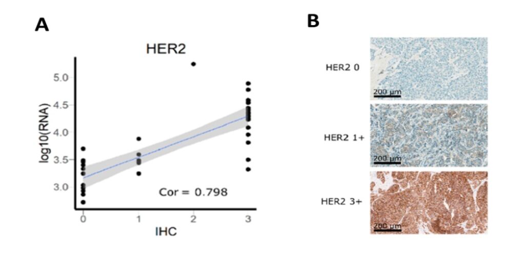 В своем исследовании авторы для нескольких видов опухолей показали наличие четкой корреляции между уровнем экспрессии четырех разных генов-маркеров опухоли, измеренных методом РНК-секвенирования, и результатами иммуногистохимического окрашивания (Рисунок 1) .