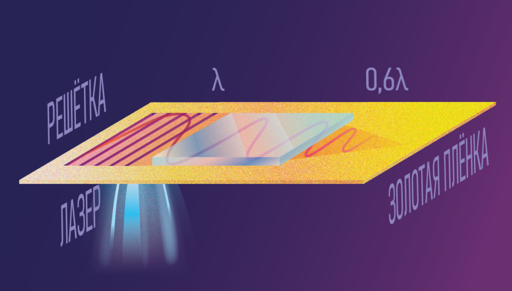 При облучении такой системы лазером в плоскости раздела между золотом и диэлектриком возникает возмущение в виде так называемого поверхностного плазмона-поляритона. Оно представляет собой коллективное колебание электронов в металле (плазмон), согласованное с распространением по поверхности световой волны (поляритона). Ценность этого превращения в том, что поверхностные плазмоны-поляритоны поддаются субволновой фокусировке, то есть их можно локализовать сильнее, чем породивший их лазерный импульс.