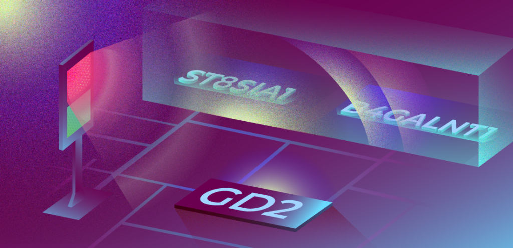 Чтобы понять, какие гены сильнее связаны с GD2-фенотипом, ученые сравнили уровни экспрессии генов, вовлеченных в биохимический путь синтеза ганглиозидов. В анализ также добавили пару из двух «ближайших» ферментов — катализаторов синтеза самого GD2 и его непосредственного предшественника.