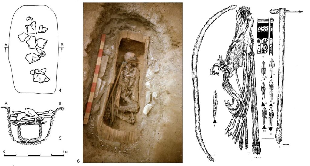 Захоронение подростка в колоде, лук, колчан со стрелами, наконечники стрел и чекан. Источник: Stratum plus