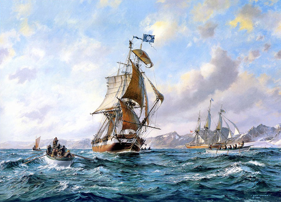 Американски китобойные суда в антарктических водах. Художник: Рой Кросс