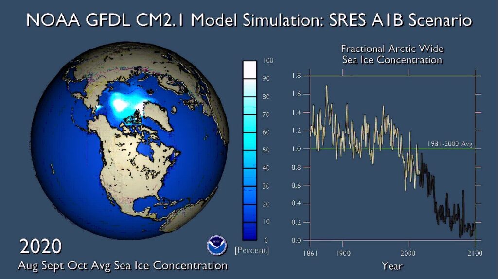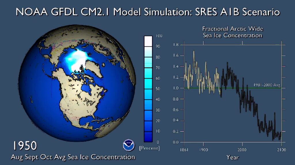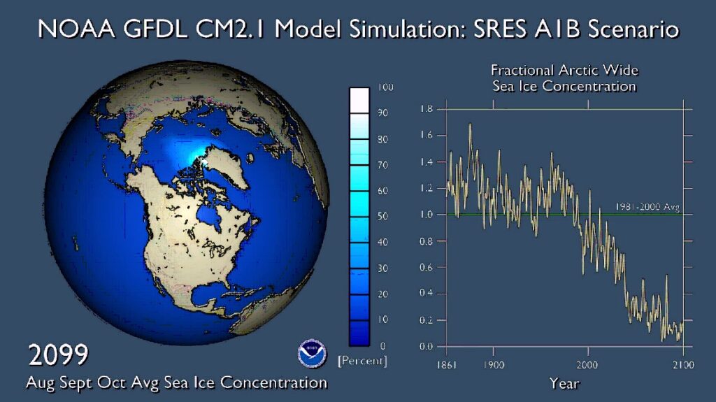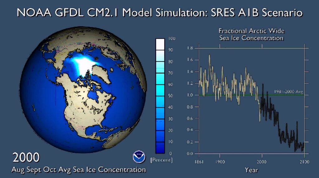 Изменение объема арктического льда на протяжении XIX–XXI веков, согласно модели Национального управления океанических и атмосферных исследований США