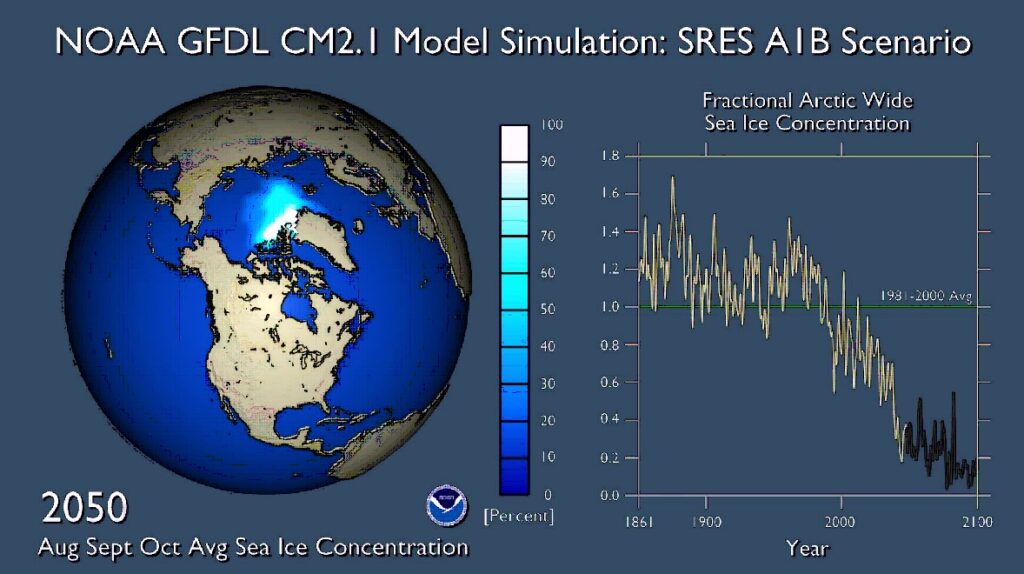 Тают и арктические льды между Гренландией, российским и канадским побережьем Северного Ледовитого океана. В лаборатории геофизической гидродинамики Принстонского университета более десяти лет назад была создана климатическая модель, которая позволяет получить прогноз изменений площади многолетнего арктического льда на основе данных наблюдений с конца XIX века. Согласно этой модели, к концу текущего столетия арктический лед практически полностью исчезнет. Однако данные наблюдений последнего десятилетия оказываются более пессимистичными, нежели предсказывает эта модель. Только за последние 30 лет площадь многолетнего льда сократилась более чем в два раза.