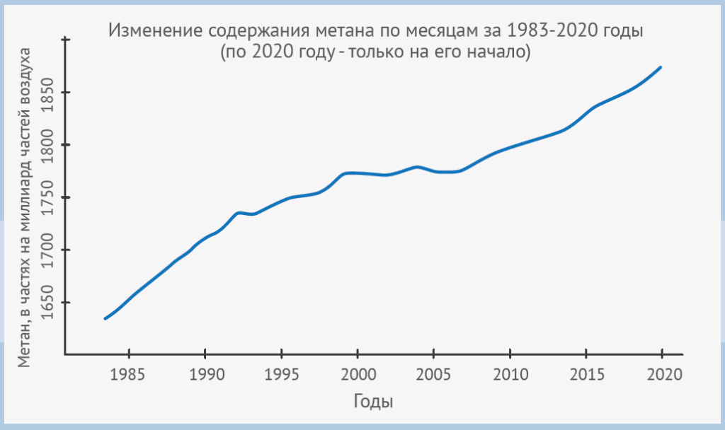 Углекислый газ — не единственная «длинная рука» Арктики, с помощью которой она может повлиять на климат всей планеты. Возможно, еще более важен метан. Исторически при сильных оледенениях его концентрация падала до 0,35 частей на миллион (ppm), в доиндустриальное время составляла 0,7 частей на миллион, а сейчас в Арктике, по западным данным, — 1,9 ppm.