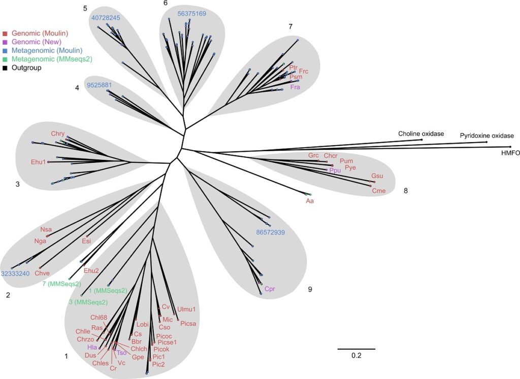 Рисунок 2. Филогенетическое древо исследованных фотодекарбоксилаз. Белки образуют несколько кластеров, в некоторых из которых нет представителей известных микроорганизмов. Источник: Catalysts