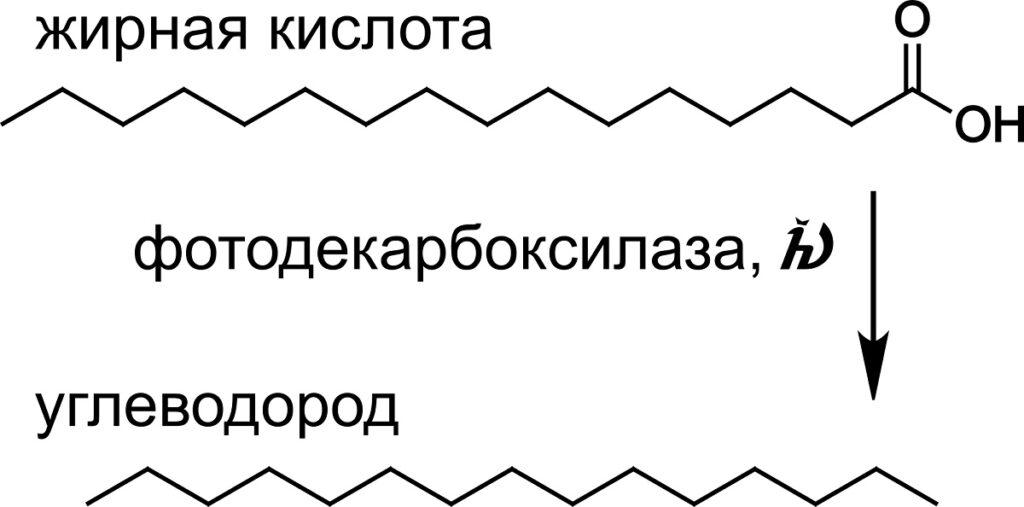 Рисунок 1. Реакция, катализируемая фотодекарбоксилазой. Изображение предоставлено автором исследования.