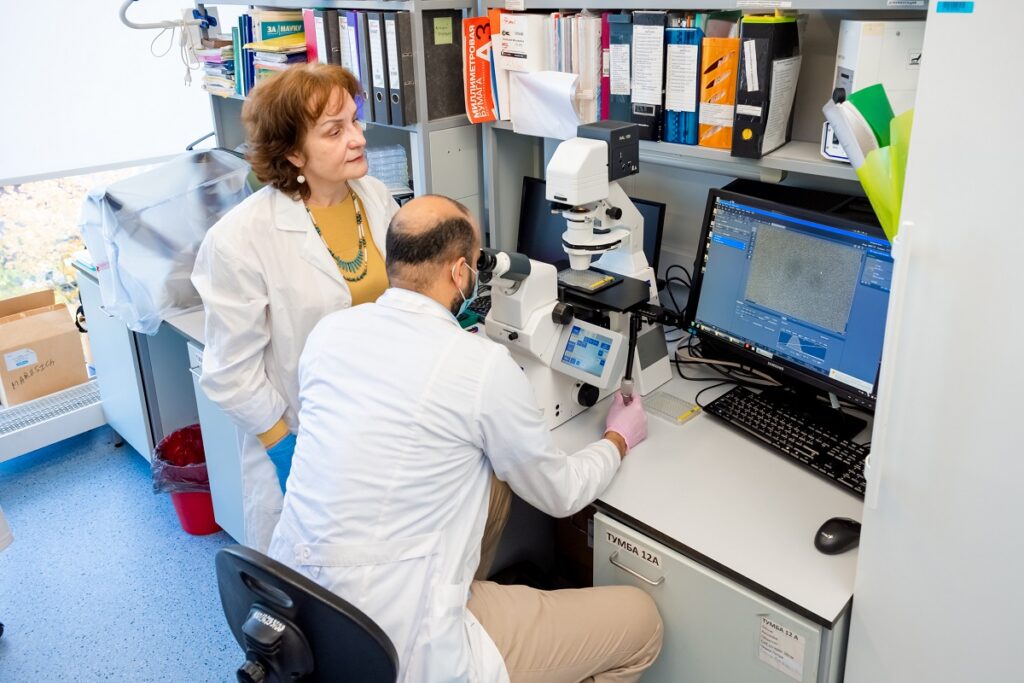Руководитель проекта Елена Марусич и аспирант МФТИ Мохамед Хекаль за работой в лаборатории разработки инновационных лекарственных средств и агробиотехнологий МФТИ. Фотограф: Наталья Арефьева