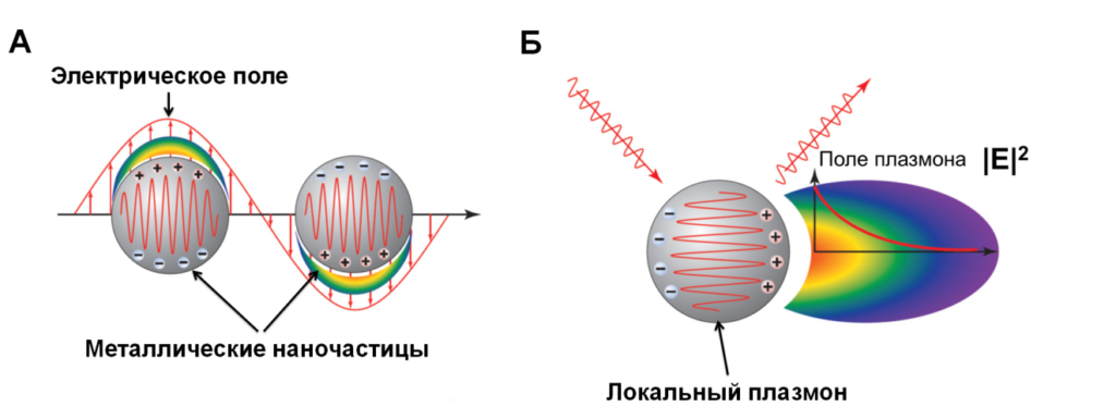 Рисунок №2. Возбуждение локального поверхностного плазмонного резонанса электрическим полем (А) и распределение интенсивности поля вокруг наночастицы с возбужденным плазмоном (Б). Источник: «Успехи биологической химии», т. 55, 2015, с. 391–420, «Детекция межмолекулярных взаимодействий, основанная на регистрации поверхностного плазмонного резонанса», Д. В. Сотников, А. В. Жердев, Б. Б. Дзантиев
