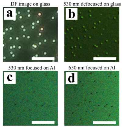 [columns size=»2/3″ last=»false»]Предложенный авторами метод лишен этих недостатков — он основан на том, что наночастица на металле поглощает падающее излучение с частотой, близкой к частоте плазмонного резонанса, поэтому на изображении частица будет выглядеть темным пятном. Длина волны, при которой происходит плазмонный резонанс, в серебряной наночастице на алюминии около 700 нм, поэтому при длине волны лазера в 650 нм картинка получается более четкой.[/columns]