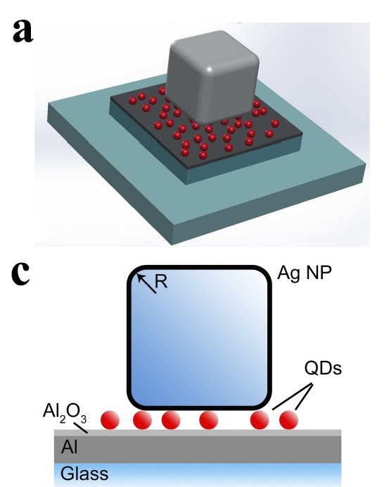 Рисунок №1. (а, с) схематическое устройство нанопатч-антенны. На стекло нанесен слой металла — алюминия, который, окисляясь, покрывается пленкой Al2O3, являющегося диэлектриком. Далее нанесен слой квантовых точек — небольших кристаллов сульфида или селенида кадмия, способных под воздействием электромагнитного излучения испускать свет определенной длины волны. Выше расположены кубические наночастицы серебра размером 80 нм. Источник: Nanotechnology