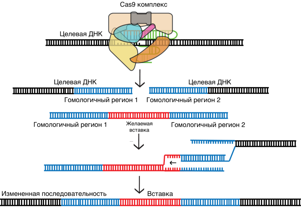Схема гомологичной рекомбинации после разрыва ДНК со вставкой интересующего участка. Источник: sites.tufts.edu