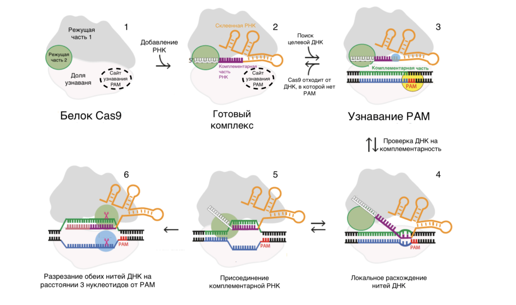 Для распознавания целевого участка РНК должна образовывать комплементарные пары с последовательностью ДНК. В структуре комплекса Cas9 с РНК нуклеотиды принимают нужное положение, чтобы иметь возможность соединиться с ДНК. При этом последовательность PAM также должна присутствовать рядом с мишенью. Белок Cas9 сначала ищет последовательность PAM, а после обнаружения исследует возле нее ДНК на предмет комплементарности с РНК в комплексе. Взаимодействия между PAM и комплексом приводят к расхождению цепей ДНК, после чего РНК связывается с комплементарным участком ДНК при его наличии.