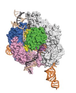 Сегодня ученые понимают, как комплекс распознает свою мишень и запускает расщепление ДНК. Структура Cas9 имеет две отдельные части: часть узнавания целевой ДНК и режущую ДНК долю с двумя активными участками — доменами, каждый из которых расщепляет одну из нитей полимера.