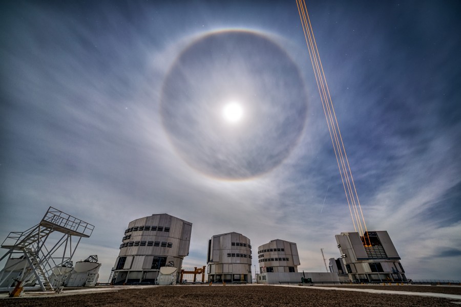 Лунное гало и лазерные лучи, формирующие искусственную звезду над VLT. Источник: Juan Carlos Muñoz-Mateos/ESO