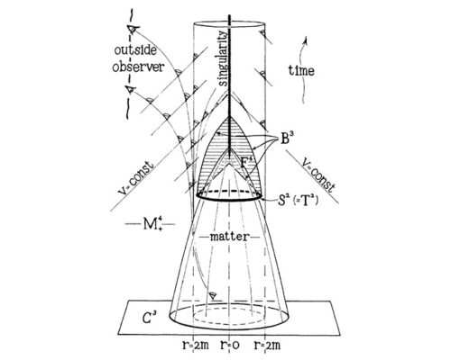 Даже в той самой статье «Гравитационный коллапс и пространственно-временные сингулярности», опубликованной в журнале Physical Review Letters в 1965 году, за которую и присуждена Нобелевская премия, немалую часть объема занимает иллюстрация. Ею Пенроуз демонстрирует, как материя, сжимаясь, формирует сингулярность — то есть «схлопывается» в точку с координатой r = 0. Образуется сверхмассивный компактный объект. При этом лучи света, изображенные на рисунке под углом 45о, уходят за горизонт событий и не доходят до внешнего наблюдателя, поэтому за такими объектами закрепилось предложенное американским физиком-теоретиком Джоном Арчибальдом Уилером название «черная дыра». Рисунок симметричен, но в статье доказывается, что сингулярность формируется и при нарушении симметрии.