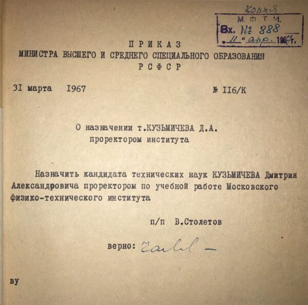 Проректор посвятил университету почти 50 лет своей жизни. За это время он всегда оставался честным перед Физтехом, был его настоящим патриотом и работал во благо его развития. Профессор всегда пользовался авторитетом среди коллег за порядочность и мудрость, исключительное трудолюбие, требовательность и невероятный ум. Дмитрий Александрович Кузьмичёв несомненно является славой и гордостью нашего университета.