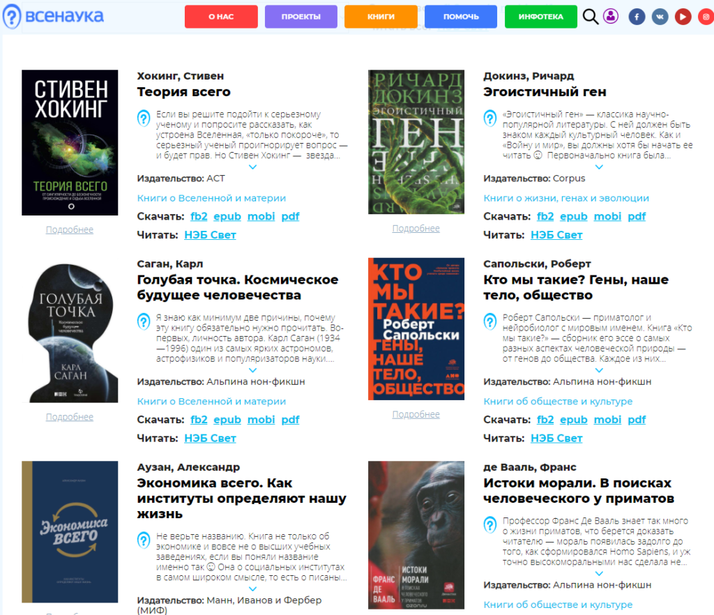 Список бесплатных книг будет пополняться. Просмотреть же всю коллекцию научно-популярной литературы, которая была оценена экспертами, можно в навигаторе «Всенауки».