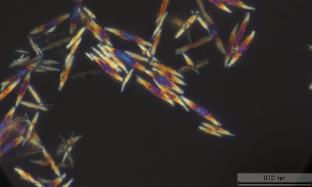 Кристаллы цианурата меламина в поляризационном свете соотношение компонентов 1 к 1. Фото авторов статьи из ИТМО