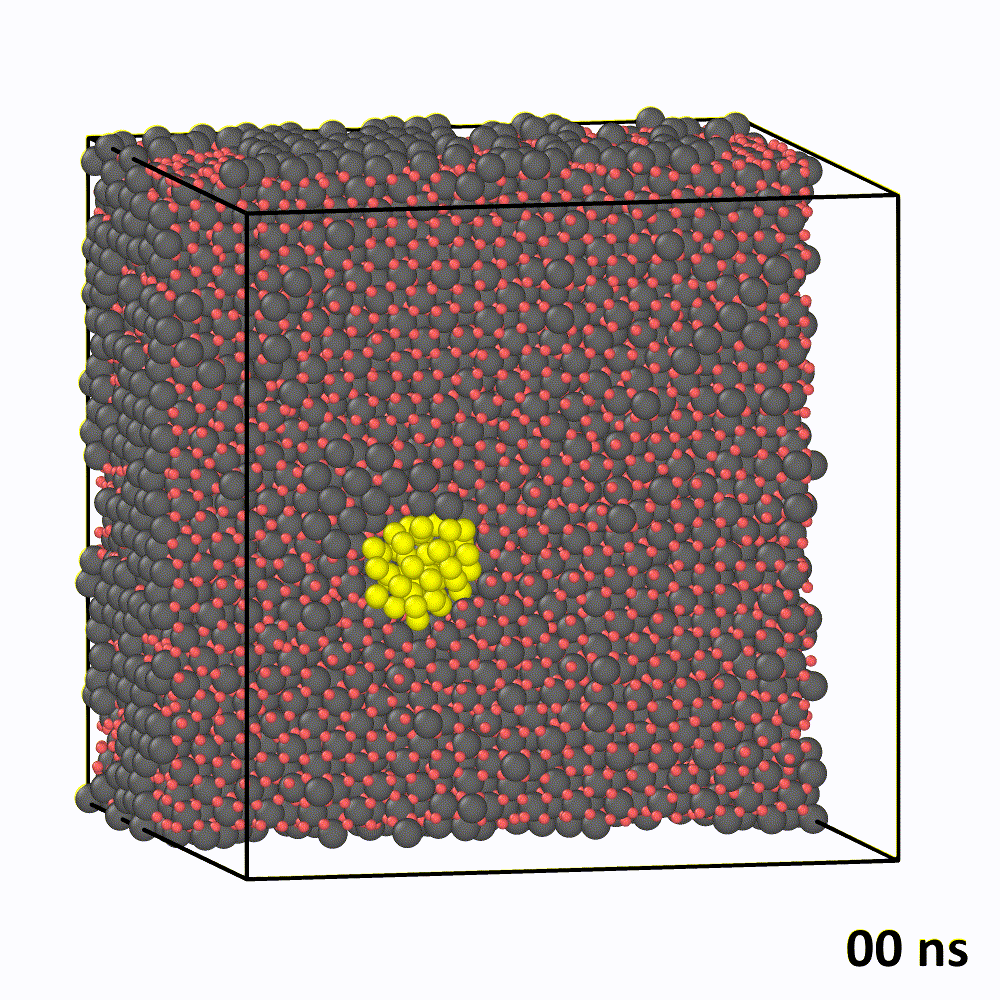 Пример расчетной ячейки: кристаллическая решетка диоксида урана (серые атомы — уран, красные — кислород), содержащая пузырь ксенона (желтые атомы). Черным цветом показаны атомы урана, вытесненные в междоузельные положения. Такой кластер междоузлий существенно ускоряет диффузию пузыря. Предоставлено авторами статьи