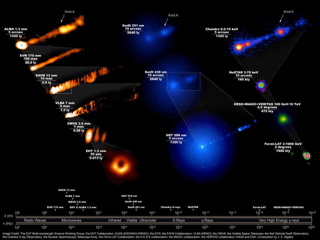 Комбинированное изображение, показывающее, как выглядела радиогалактика M87 во всем электромагнитном спектре во время кампании Телескопа горизонта событий в апреле 2017 года по получению первого изображения черной дыры. Данные во всем спектре были собраны командой из 760 ученых и инженеров из почти 200 учреждений из 32 стран или регионов с использованием 19 обсерваторий на Земле и в космосе для регистрации излучения во всем спектре. Это изображение показывает огромные масштабы, охватываемые черной дырой и ее мощным джетом, направленным на нас. Источник: EHT Multi-Wavelength Science Working Group; the EHT Collaboration; ALMA (ESO/NAOJ/NRAO); the EVN; the EAVN Collaboration; VLBA (NRAO); the GMVA; the Hubble Space Telescope, the Neil Gehrels Swift Observatory; the Chandra X-ray Observatory; the Nuclear Spectroscopic Telescope Array; the Fermi-LAT Collaboration; the H.E.S.S. collaboration; the MAGIC collaboration; the VERITAS collaboration; NASA and ESA. Composition by J.C. Algaba.