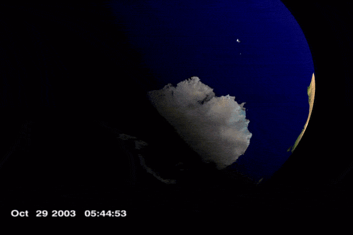 Полярное сияние на Южном полюсе, вызванное выбросом коронального вещества, было запечатлено системой IMAGE осенью 2003 года. Источник: NASA’s Goddard Space Flight Center Scientific Visualization Studio/Tom Bridgman, lead animator