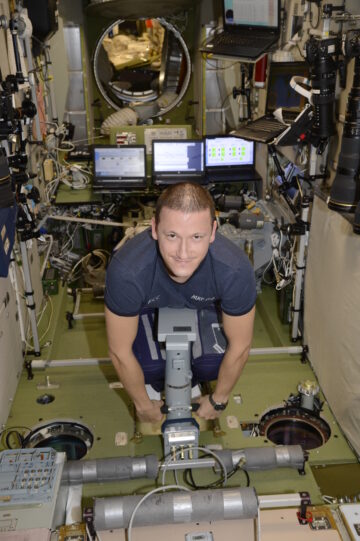 Космонавт Роскосмоса Сергей Кудь-Сверчков выполняет периодическое взвешивание своего тела на установке «Измеритель массы». Источник: Роскосмос
