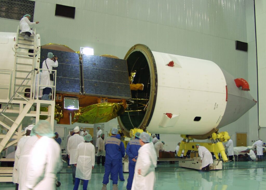 Подготовка КА «Ямал-201» и «Ямал-202» к совместным электрическим проверкам. Фото из книги Н. Н. Севастьянова «Космические системы Газпрома»